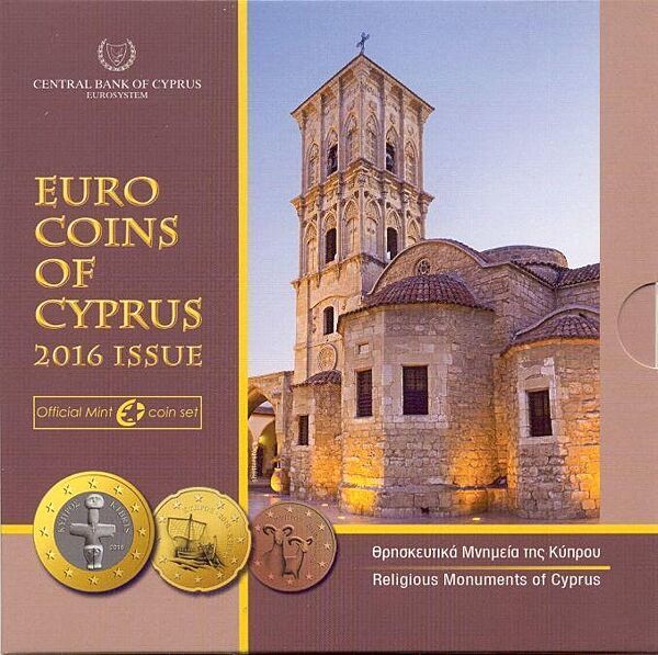 Офіційний річний набір монет Євро - Кіпр 2016 Оригінальний буклет національного банку Кіпру 2016 рік. Повний випуск: 1, 2, 5, 10, 20, 50 міліграмів; 1, 2 Євро. Заводський блістер, сертифікат Brilliant Unciruclated Тираж 7.000 Випуск присвячений священним пам´ятникам Кіпру: храм Свтого 594 в Ларнаку, храм Святої Параскеви в Героскіпу, храм Святих Варнавів і Ілоріона в Перистерону Кіпр не має свого монетного двору. З 2008 по 2009 р.г. монети Кіпру почоканилися монетним двором Фінляндії, а з 2010 року, на замовлення центрального банку Кіпру, чеканку монет Кіпру здійснює Греція.