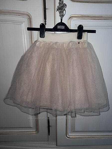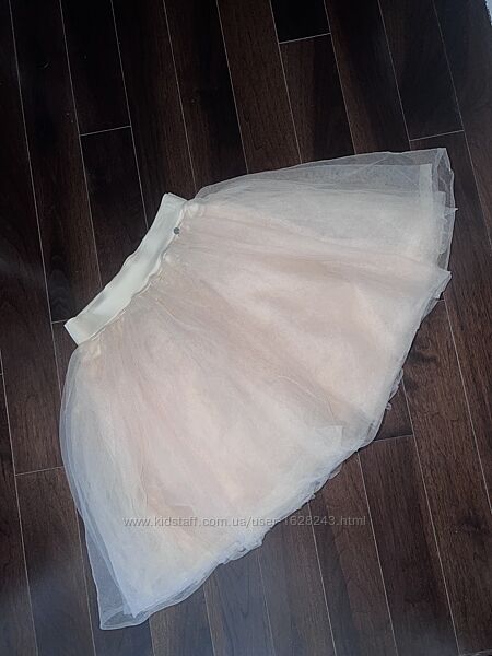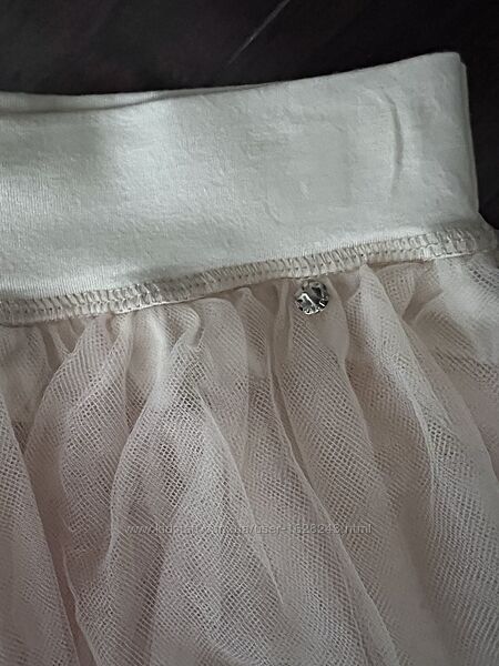 Дуже пишна спідниця-пачка відомого дитячого бренду Fun Fun, привезена з Італії. На поясі монетка з логотипом бренду. Шифонові волати нашити на бавовняну підспідницю воланами, завдяки чому вона виглядає дуже пишно.Розмір 34, приблизно на 8-10 років.