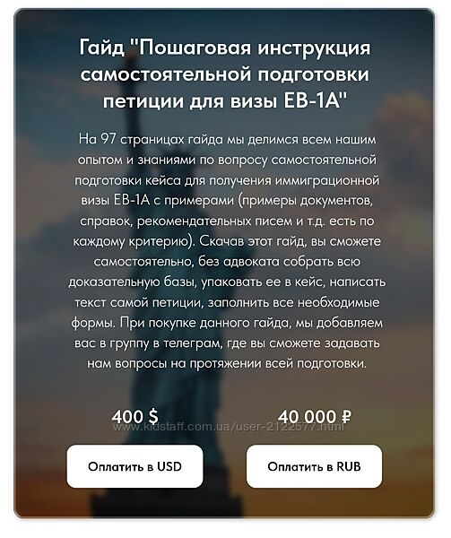 На 97 страницах гайда мы делимся всем нашим опытом и знаниями по вопросу самостоятельной подготовки кейса для получения иммиграционной визы EB-1A с примерами (примеры документов, справок, рекомендательных писем и т.д. есть по каждому критерию). Скачав этот гайд, вы сможете самостоятельно, без адвоката собрать всю доказательную базы, упаковать ее в кейс, написать текст самой петиции, заполнить все необходимые формы. При покупке данного гайда, мы добавляем вас в группу в телеграм, где вы сможете задавать нам вопросы на протяжении всей подготовки.