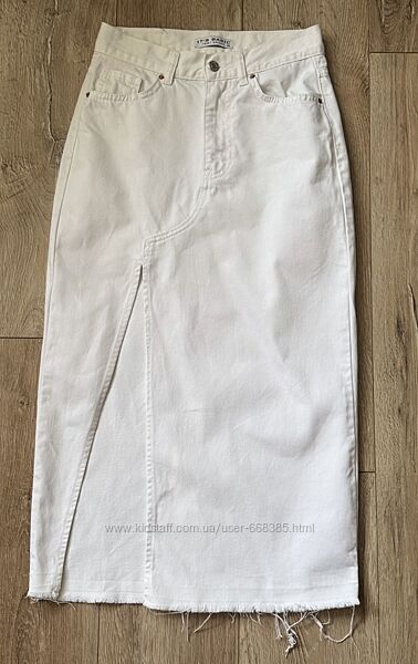 Шикарна білосніжна джинсова маки спідниця, з цікавим акцентом у вигляді розрізу на праву ніжку, край не оброблений