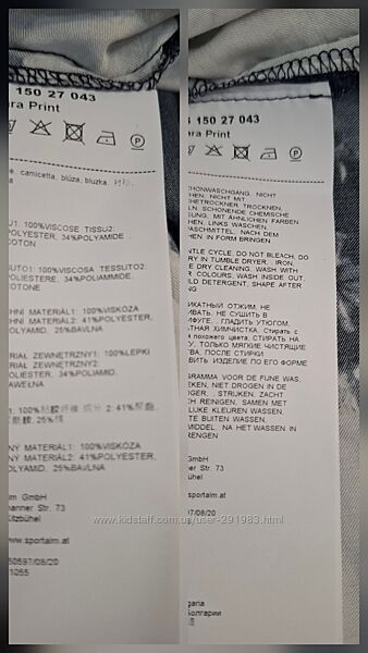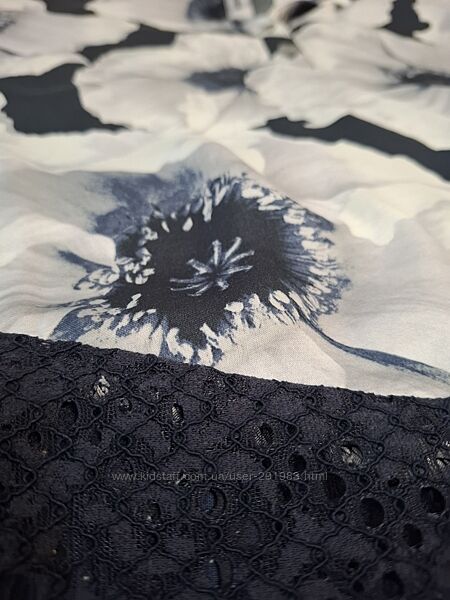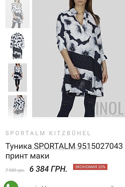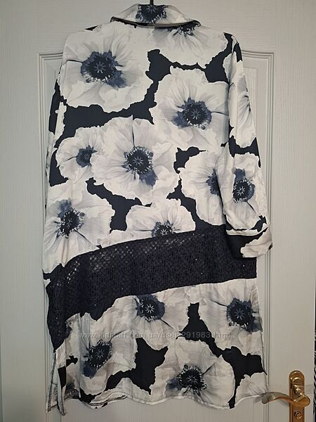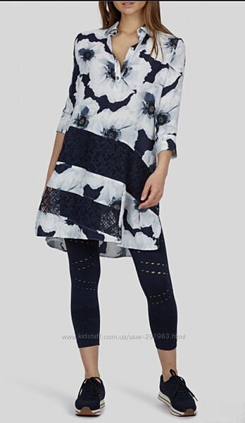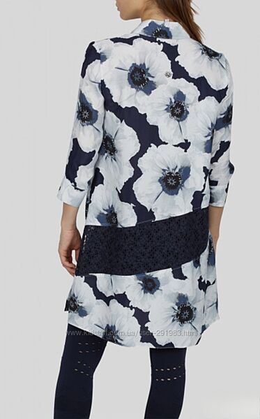 Невагома туніка Sportalm з квітковим принтом та мереживними вставками Ця вишукана туніка від Sportalm поєднує в собі стиль та комфорт, створюючи неповторний образ для сучасної жінки. Особливості: * Привабливий дизайн: Туніка виконана у принті з великими білими квітами на темно-синьому тлі, що надає їй свіжого та елегантного вигляду. * Оригінальні деталі: Поділ туніки прикрашений фактурними мереживними вставками. Це створює динамічний візуальний ефект та додає виробу унікальності. * Стильний крій: Вільний крій туніки забезпечує комфорт та не обмежує рухів. * Зручні рукави: Рукави довжиною 3/4 можна носити як розправленими, так і загорнутими для більш невимушеного вигляду. * Матеріал: Виготовлена зі 100% віскози, туніка надзвичайно легка, м´яка та приємна до тіла, забезпечуючи максимальний комфорт протягом дня. * Універсальність: Ця туніка ідеально підходить для повсякденного носіння, зустрічей з друзями, прогулянок або навіть для створення ошатного образу. Вона чудово поєднується як зі спортивним взуттям, так і з елегантними туфлями. Sportalm — це преміальний австрійський бренд, що спеціалізується на створенні високоякісного спортивного та повсякденного одягу. Відомий своїм вишуканим дизайном, інноваційними матеріалами та бездоганною якістю пошиття, Sportalm поєднує традиції та сучасні тенденції, пропонуючи унікальні та стильні рішення для активних і модних людей. Заміри: НО бюста (від пахви до пахви) 56 см, вся довжина 93 см, НО стегон 57 см. Ціна таких речей Sportalm приблизно. 300 євро. З дефектів лише ледь помітна зачіпка на рукаві. Без повернення.