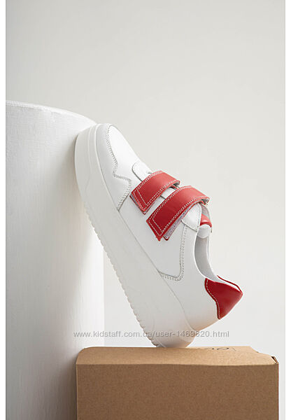 Женские кожаные кроссовки на липучках белые с красными вставками.Верх: натуральная кожа.
