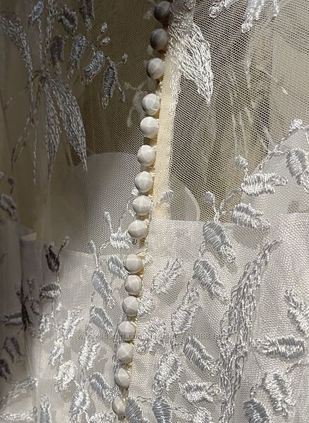 Обʼємні рукави-буфи — символ весільної моди цієї епохи, з високими манжетами, прикрашеними 14 декоративними гудзиками