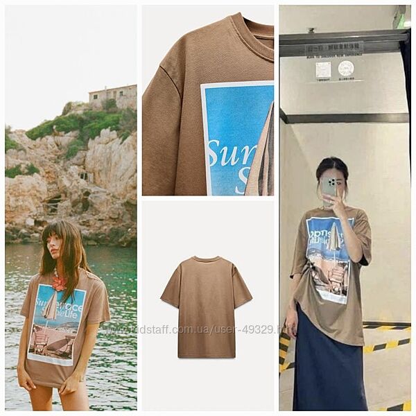 Нова трендова футболка Zara зі 100% бавовни, з круглим вирізом. Фотографічний принт. Розмір S, L. Заміри надам.Також продається все, що на фото.