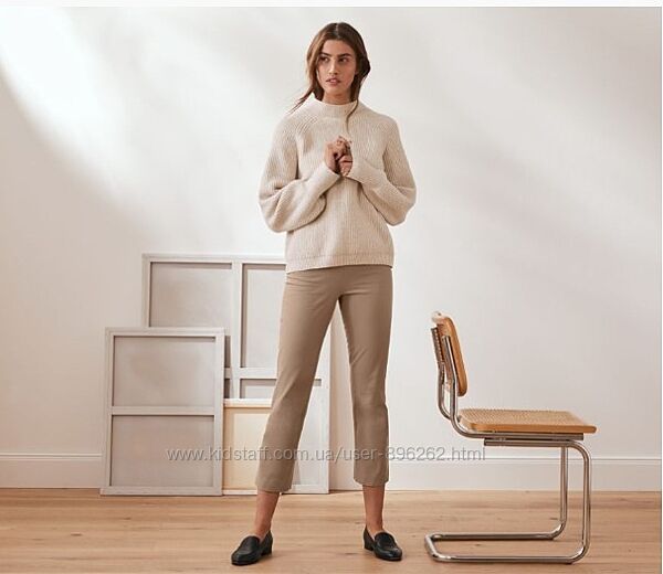 Жіночі штани з еластичним поясом. Вузькі штанини злегка укороченої довжини. З еластаном: зберігають форму, ідеально сидять та мають високий комфорт при носінні. Наша модель (1,78 м) носить розмір 36. Перевірено на наявність шкідливих речовин зовнішніми акредитованими інститутами.