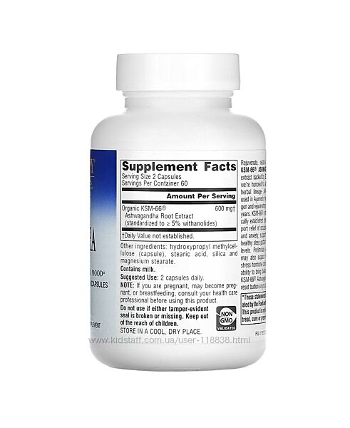 Органічний KSM-66® Екстракт кореня ашваганди (стандартизований до вмісту ≥ 5% спиртів) = 600 мг