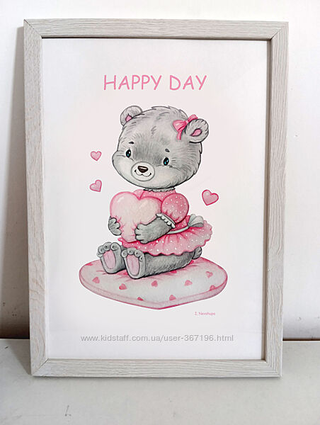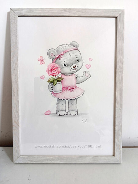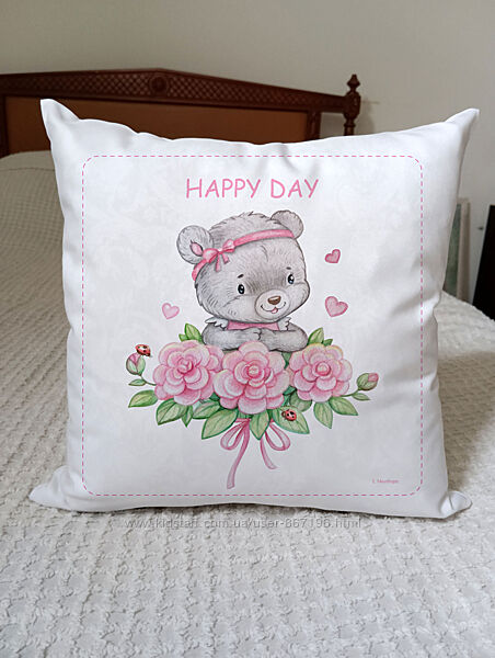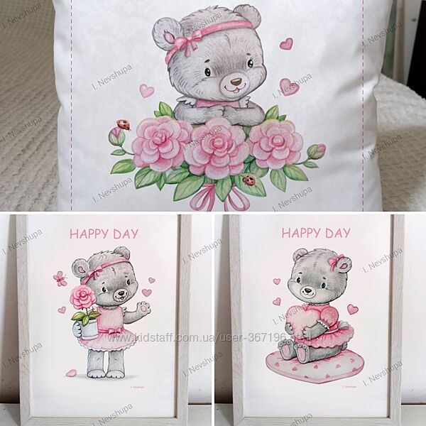 Офомлення дитячої кімнати. Красива дизайнерська подушка з нової серії "Ведмедик у рожевому". Якісний друк, тканина габардін, наволочка на блискавці, всередині біла подушка. Розмір 35х35см.Разом з подушкою можна придбати авторську акварельну картину А4-600грн, або репродукцію А4, А3 з цієї серії.
