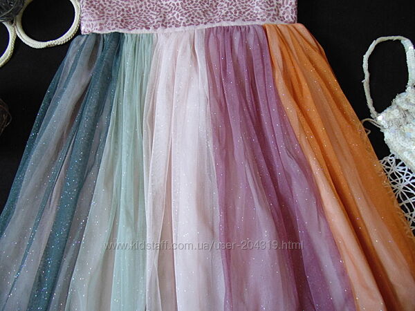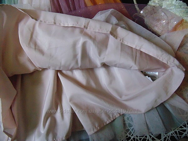 Святкова фатинова сукня з ліфом, розшитим паєтками, ґудзиками ззаду та розкльошена спідниця з кількох шарів фатину. На підкладці.