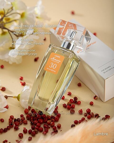 Лише кілька крапель аромату Ламбре №30 - і навіть найсуворіший повсякденний образ набуває спокусливої чарівності. Тонкий, незабутній парфумерний букет з нотками рожевого перцю, ірису, жасмину і пачулі. Залишає шлейф, наповнений акордами чарівного ветівера і чуттєвого мускусу.