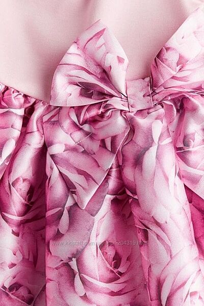 Шов посередині з декоративним бантом та підкладкова, розкльошена спідниця з тканої тканини з блиском та друкованим візерунком.