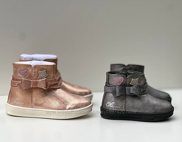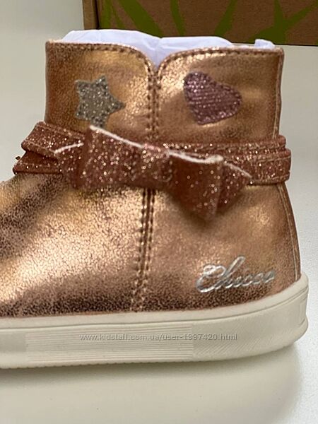 Детские сапожки ChiccoБлестящие сапожки на молнии с бантиками с боку и аппликациями в форме сердца/ звездочки.