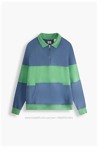 Ретро-світшот-поло Levi´s® м’ятного кольору з рукавом реглан і блискавкою. Яскрава ретро-зелено-блакитна кольорова конструкція створює крутий вінтажний спортивний стиль 70-х, схожий на класичну футболку для регбі. З ретро-рукавами реглан, кишенею «кенгуру» та зручною конструкцією з трикотажу. Оздоблення бічним швом Levi´s® Red Tab.Зелено-синій світшот-поло Levi´s® на блискавці 1/4 із кольоровими блоками.
