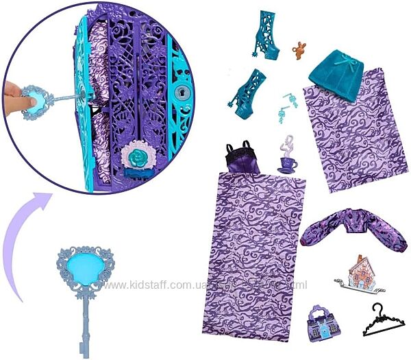 Квест з сюрпризами: використовуйте ключ-лупу для пошуку символів на карті та відчиняйте дверцята шафи, щоб знайти таємничі жетони.Магія відкриттів: з´єднайте жетони та вставте їх у шафу, щоб побачити Твайлу в усій її моторошно-квітковій красі!Безліч перевдягань: завдяки понад 125 можливим комбінаціям одягу та аксесуарів, створіть для Твайли унікальні образи.Легкість зберігання: усі елементи набору можна зберігати у шафі, яка стане чудовим органайзером для аксесуарів і одягу.Цікаві аксесуари: у наборі є ключ-лупа, карта, жетони, вішаки та багато інших деталей для повного занурення у гру.У комплекті: