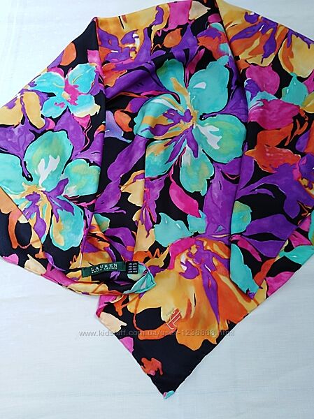 Шикарный шелковый платок Lauren Ralph Lauren.Изготовлен из натурального саржевого шелка,шов роуль, логотип бренда вышит золотыми нитками.Размер 88,5х93см.,цвета яркие.