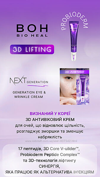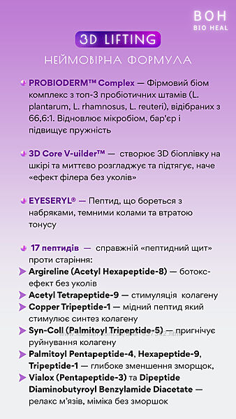 BIOHEAL BOH Probioderm™ 3D Lifting Eye & Wrinkle Cream — це не просто крем, а науково обґрунтований біоінженерний догляд для делікатних зон, де шкіра старіє найшвидше. 🧬 Запатентований комплекс PROBIODERM™, 17 пептидів, 3D-ліфтинг технологія, мікробіомний захист і клінічно доведені результати — усе в одному флаконі. ✨ Якщо ви шукаєте ефективний антивіковий крем, який справді працює з усіма видами зморщок, набряками, темними колами та втратою тонусу — це ваш must-have.
