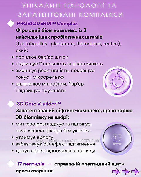 ➡️ Властивості 🔬 3D-ліфтинг та ущільнення Завдяки фірмовому комплексу Probioderm™ та пептидній матриці, крем надає ефект тривимірного ліфтингу — делікатно підтягує контури обличчя, ущільнює шкіру та зменшує провисання.
