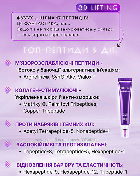 ➡️ 3D-ліфтинг, що змінює погляд на антивіковий догляд! 🌟 Інноваційна формула, яка не просто доглядає, а реконструює делікатну зону навколо очей, надаючи їй об’єм, пружність та молодий вигляд.