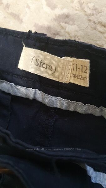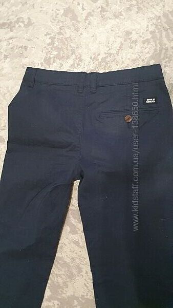 Сучасні брюки, ідеально в школу і не тільки. На худорлявого хлопця або середньої статури. Темно-сині (абсолютно нові). Склад 98% бавовна, 2% еластан.На бірці зріст 140-152см. Довжина 93 см, ширина в талії 34,5см.