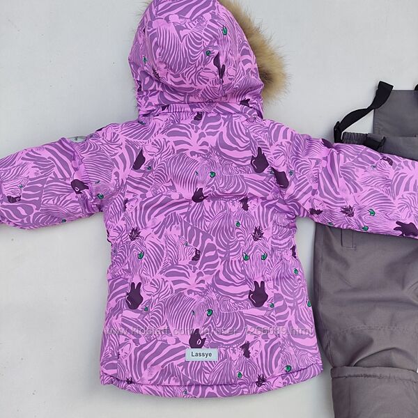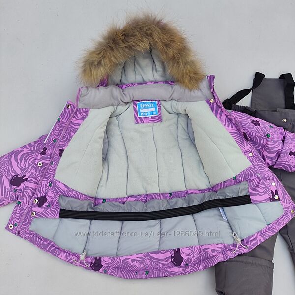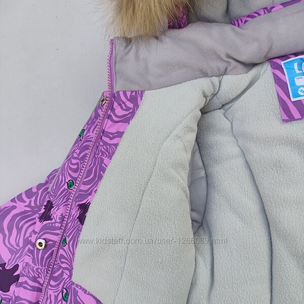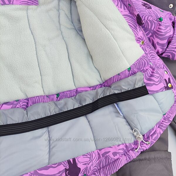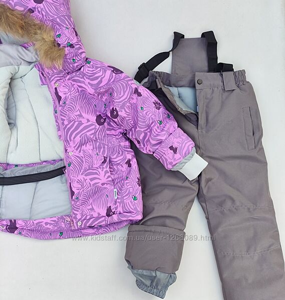 Куртка з гарним абстрактним орнаментом. Напівкомбінезон сірого кольору. Підкладка в капюшоні, на стійці коміра, спинці та грудях куртки з м´якого та приємного на дотик флісу. У рукавах підкладка нейлонова. Усередині рукава вшитий м´який манжет. Блискавка на куртці прикрита вітрозахисною планкою на кнопках, є захист від прищипування підборіддя.