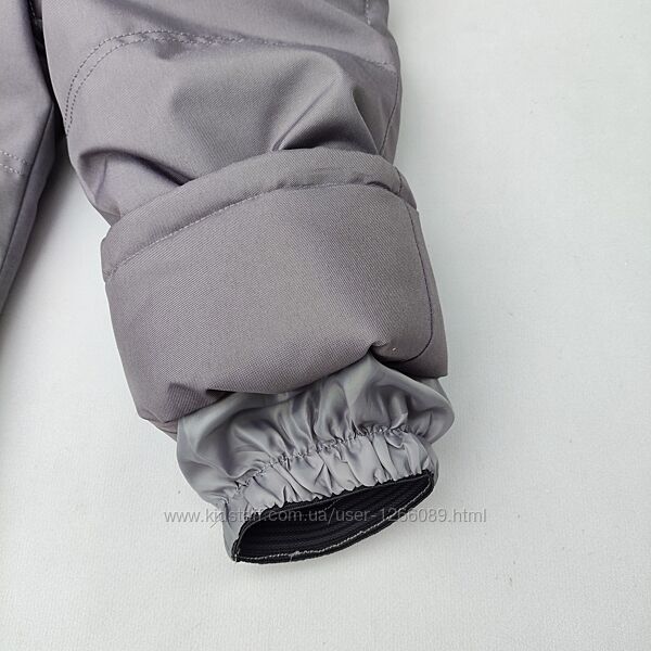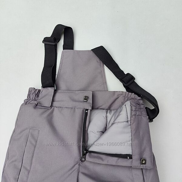 Напівкомбінезон сірого кольору. Застібається виріб спереду на блискавку. Внизу штанини для додаткового захисту від снігу вшиті гумки. Бретелі еластичні, регулюються під дитину. Довжина холоші регулюється.
