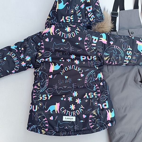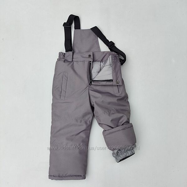 Напівкомбінезон сірого кольору на еластичних бретелях, які регулюються під Вашу дитину. Штанина підвертається до 10 см, що дуже практично. Усередині внизу штанини є захист від потрапляння снігу. Підкладка нейлонова. Кишеньки є.