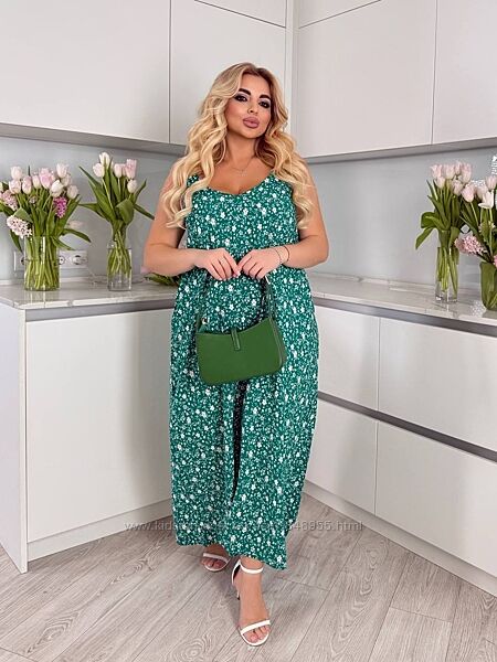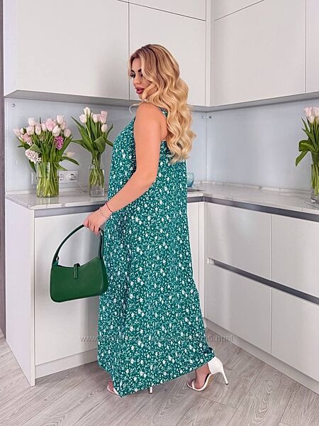 Подробное описание: Летний сарафан макси на бретелях 50-52 зелёный в белый мелкий цветочек