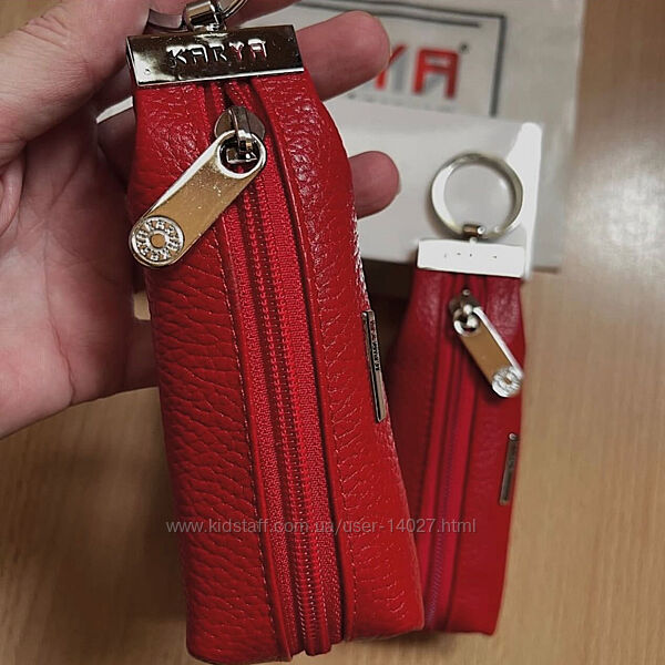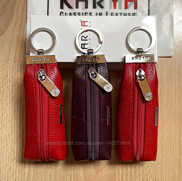 Кожаные удобные ключницы KARYAКлючницы из натуральной кожи, закрываются на молнию, внутри для крепления ключей используется кольцо. Снаружи для удобства тоже кольцо. В фирменной коробке бренда