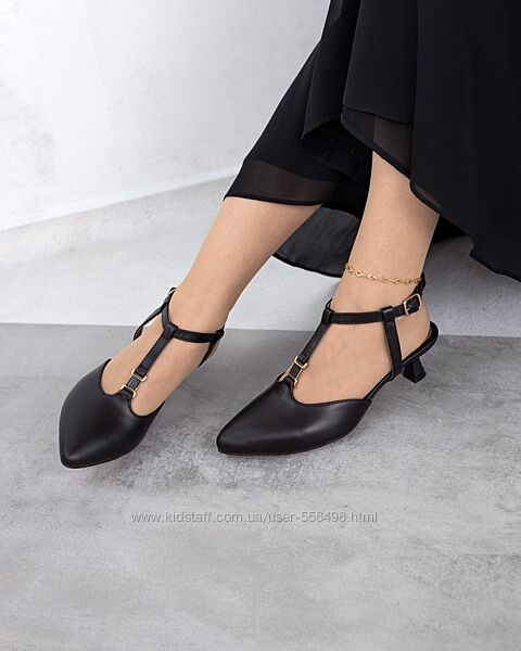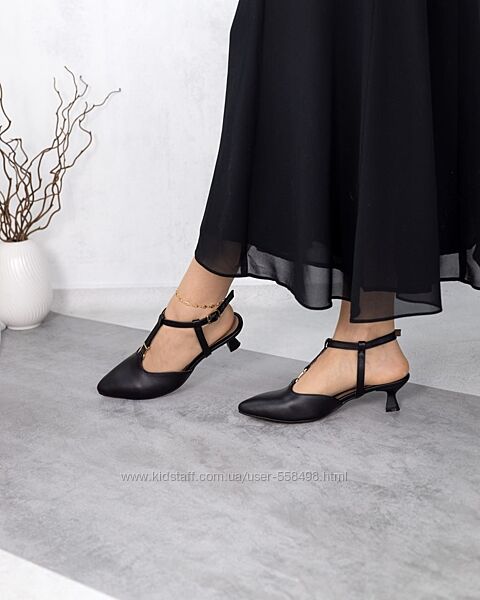 Класичні жіночі слінгбеки з натуральної шкіри в універсальному чорному кольорі. Зручний каблук 5 см додає образу елегантності та залишається комфортним когжного дня. Модель з відкритою п’яткою та акуратною застібкою.Характеристики: