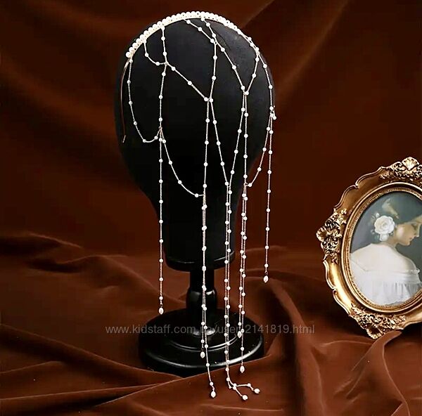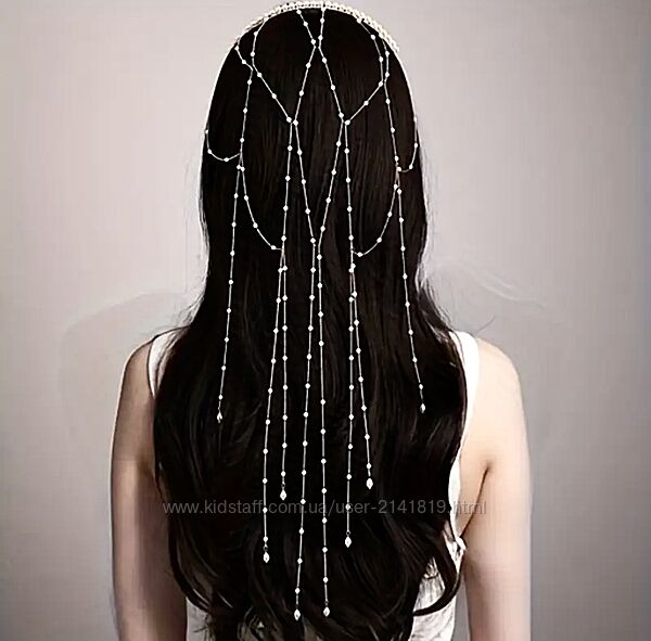 Изысканный аксессуар с цепочками и бусинами под жемчуг украсит любую прическу и подчеркнет ваш образ.Длина цепочек 50 см,