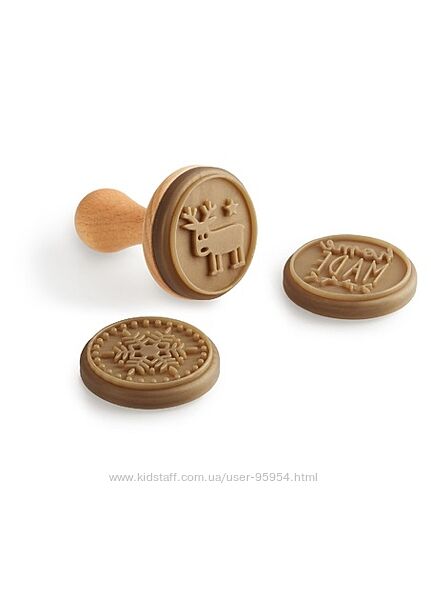 1) Штампики/формочки для печива з милими різдвяними візерунками. У набір входить дерев´яний утримувач та 3 силіконові накладки з візерунками: олень, напис Home Made та сніжинка. Розміри: діаметр 6,5 см x висота 8,5 см. Силіконові насадки можна мити в посудомийній машині.