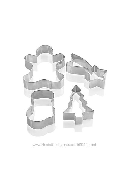 2) Набір з 4 форм, класичні новорічні мотиви: падаюча зірка, ялинка, пряникова людина, різдвяна шкарпетка. Виготовлений з високоякісної нержавіючої сталі. Можна мити в посудомийній машині. Розміри: зірка 10 х 4,5 см; ялинка 8,5 х 6 см; пряниковий чоловічок 8,5 х 11 см; різдвяна шкарпетка 8 х 5,5 см.