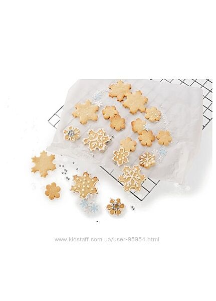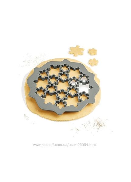 3) Форма для вирізання печива -сніжинок Завдяки оригінальному дизайну без порожніх проміжків дозволяє готувати 19 шт печива одночасно. Форму легко чистити і можна мити в посудомийній машині. Розмір приблизно 27х27 см. Матеріал пластик.