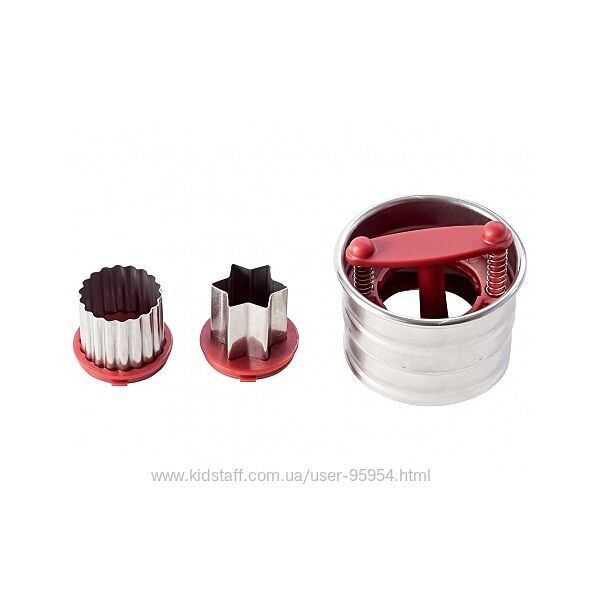 4) Форма для вирізання печива з начинкою. 1 форма з 2 меншими вставками. Пружинний штовхач для легкого видалення нарізаного тіста. Леза з нержавіючої сталі. Розмір: форма 5,8 x 4,6 см (Ø x В); вставки 3 x 2,4 см (Ø x В). Матеріали - метал, пластик.