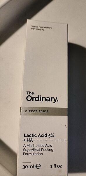 The Ordinary Lactic Acid 5% + HA 2% — сироватка на основі молочної кислоти та тасманійського перцю. 5%-ий концентрат кислоти — ніжний ексфоліант, який м´яко усуває ороговілі клітини епідермісу та глибокі забруднення.