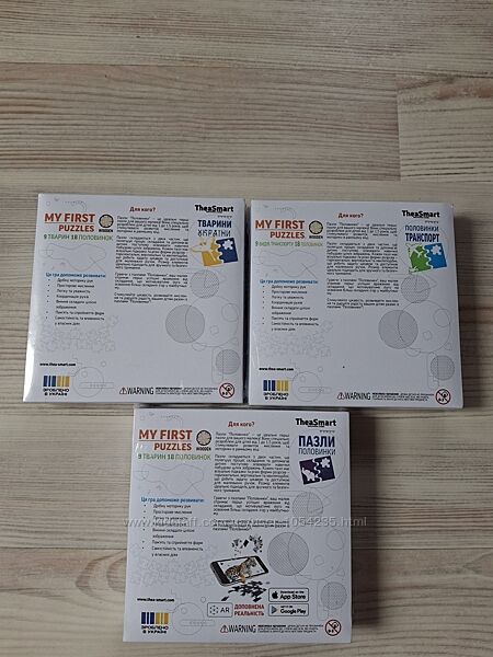 Продам качественные, интересные, с понятным изображением деревянные пазлы-половинки из серии "Мои первые пазлы": "Животные Украины", "Транспорт" и "Животные". Это идеальные первые пазлы для вашего малыша. Они специально разработаны для детей от 1 года, чтобы стимулировать развитие мышления и моторики в раннем возрасте. Пазлы состоят из двух частей, что облегчает процесс складывания и помогает ребенку постепенно осваивать навыки построения целых изображений. Каждый пазл содержит визуальные подсказки и разные формы разрезов - горизонтальные, вертикальные и волнообразные. Занятия с такими пазлами развивают мелкую моторику рук, пространственное мышление, логику и внимательность, координацию движений, память и восприятие форм. Комплектация: каждый пазл содержит 18 половинок (9 изображений). Пазлы-половинки "Животные" имеют дополненную реальность через приложение AR. Возрастная категория 1+. Цена любого набора: 400 грн.Пазлы новые, запакованные.