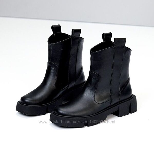 Стильні зимові черевики з натуральної шкіри на товстій підошві. Середина утеплена щільним набивним хутром. По боках петельки для зручності взування. Носок і пятка зміцнені і дуже добре тримають форму. Шкіра класної якості, взуття гарно пошите і дуже стильно виглядає на нозі. Чудові черевики за інтернет-ціною і від українського виробника.