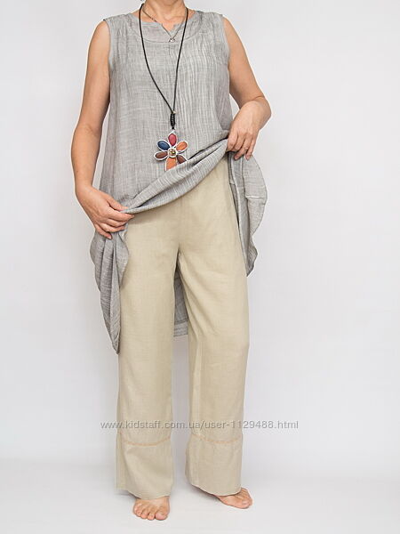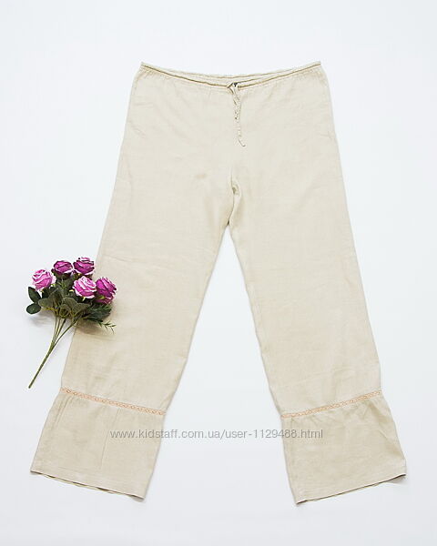 Универсальные, базовые, нейтральные, выполнены из тонкого плотного дышащего натурального льна, не просвечивают, очень приятные к телу. Прямые, свободного кроя, штанины внизу декорированы тонкой полоской кружева в тон, в поясе кулиса.