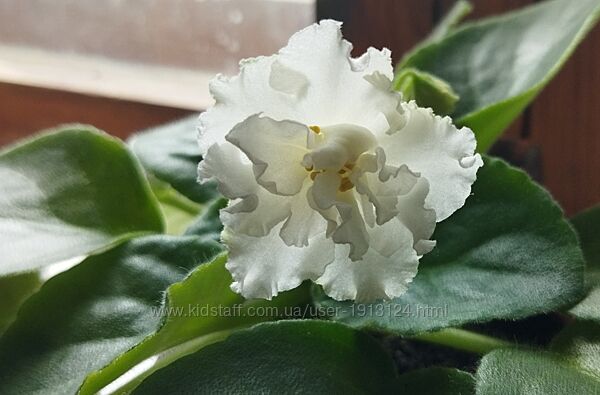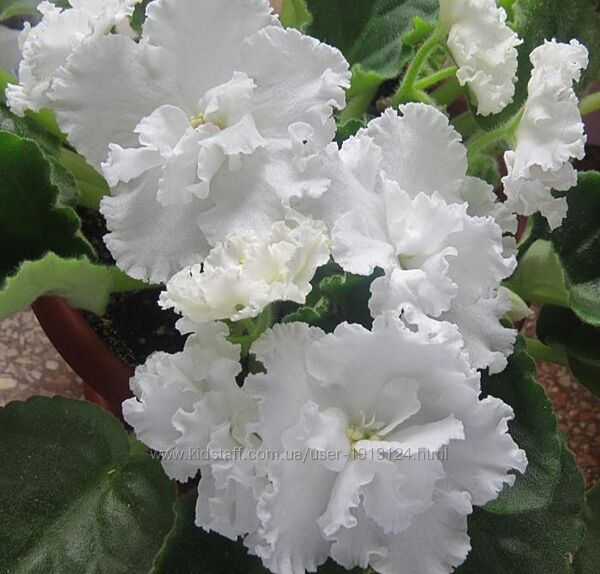 Предлагаю к приобретению укоренённые листочки сортовой фиалки Константина Морева "Букет невесты". Это сорт известный своими крупными 4-6,5 см в диаметре, махровыми, белоснежными цветами с лёгким перламутровым блеском и гофрированными краями лепестков, которые при пониженной температуре приобретают зеленоватый оттенок. У сорта компактная, симметричная розетка и регулярное обильное шапочное цветение. Цвет у розетки зелёный,ровный, глянцевый. Листья средней величины, плотные,мясистые.Сорт относительно не сложный в уходе, самостоятельно формирует розетку не требуя вмешательства.