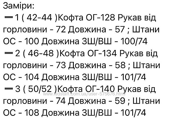 ➖2 ( 46-48 )Кофта ОГ-134 Рукав від горловини - 73 Довжина - 58 ; Штани ОС - 104 Довжина ЗШ/ВШ - 101/74