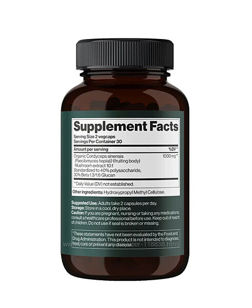 Органический экстракт гриба Cordyceps sinensis (Paecilomyces heriali) (плодное тело) 10:1, стандартизированный к содержанию 40% полисахарида, 30% бета-1,3/1,6-глюкана = 1000 мг
