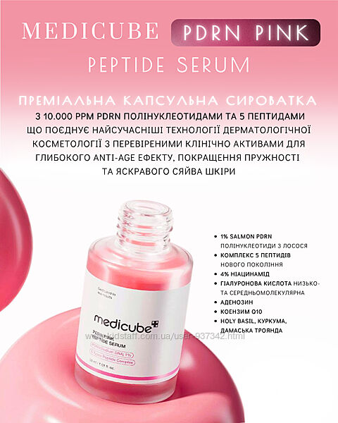 Medicube PDRN Pink Peptide Serum - преміальна капсульна сироватка з PDRN полінуклеотидами та пептидами 💎 [ 🔬 Відновлення | Омолодження | Розкіш результату ] ➡️ Поєднує найсучасніші технології дерматологічної косметології з перевіреними клінічно активами для глибокого anti-age ефекту, покращення пружності та яскравого сяйва шкіри✨ 🗝️ Ключова дія — активна регенерація, омолодження та тонус шкіри ⚪️ 1% Salmon PDRN 10.000 ppm — біоактивна молекула з ДНК лосося, яка запускає глибокі процеси регенерації в дермі, стимулює проліферацію фібробластів та значно підвищує еластичність і щільність шкіри.