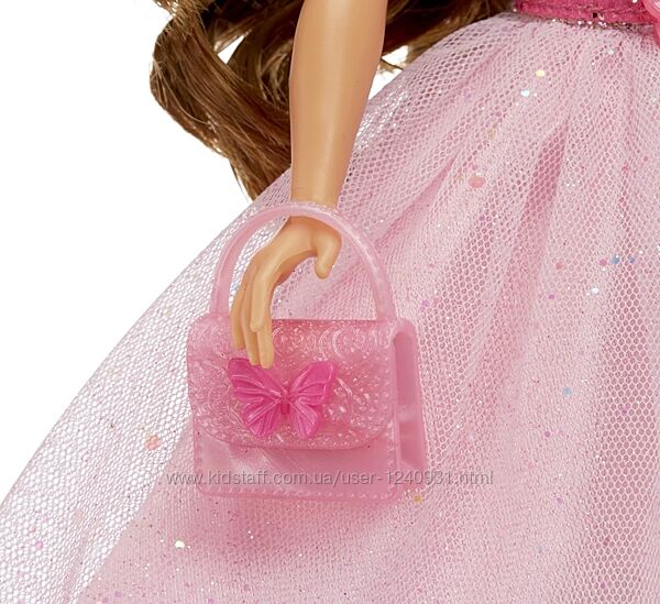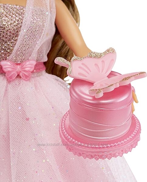 5 АКСЕСУАРІВ НА ТЕМАТИКУ МЕТЕЛИКІВ: Влаштуйте вечірку мрії про метеликів! Лялька постачається з рожевим тортом у формі метелика із золотими блискітками на крилах, золотою блискітками на голові з метеликом, рожевим поясом у формі метелика, рожевою сумочкою у формі метелика та золотими блискітками на підборах.