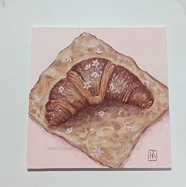 2. Картина "Квітковий круасан" - ця ніжна картина зображує апетитний круасан, щедро посипаний цукровою пудрою та прикрашений тендітними квітами. М´яка пастельна палітра додає теплоти, а текстури полотна та мазків створюють ефект справжнього домашнього затишку. Ідеально пасуватиме для кухні, кав´ярні або як подарунок для поціновувачів смачної естетики.