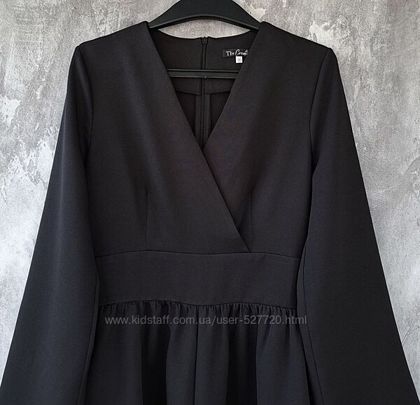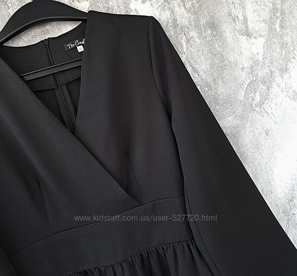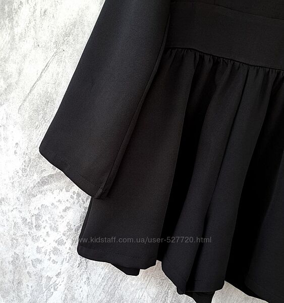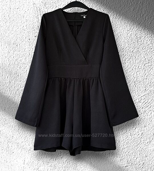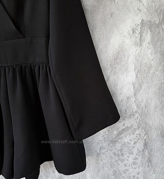 Жіночий комбінезон. Верхня частина в моделі на запАх, спідниця-шорти вільного крою, довгий рукав донизу злегка розширений . Ззаду застібається на потаємну блискавку.Тип тканини: костюмка (бірка зі складом тканини відсутня)