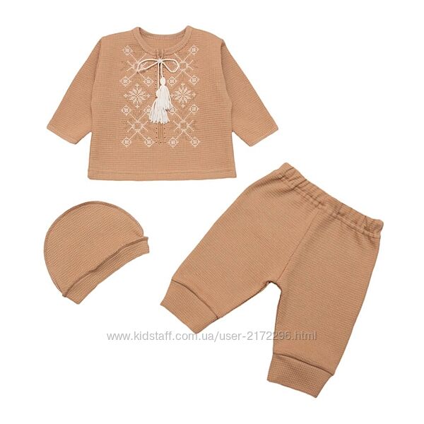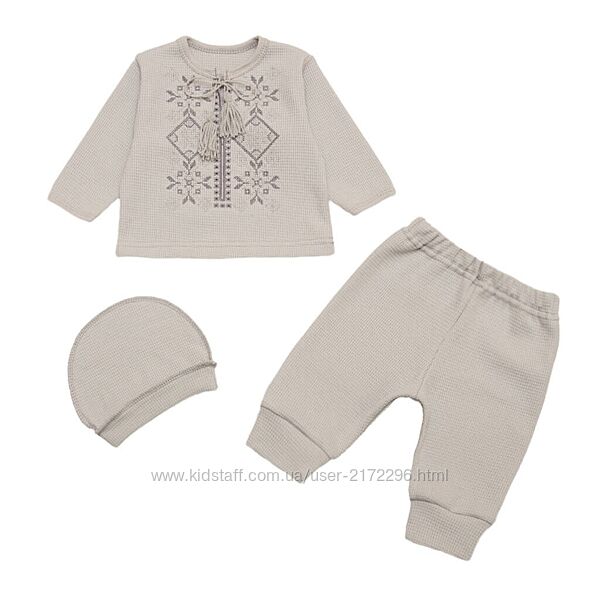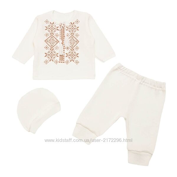 Особливі моменти в житті малюка вимагають не менш особливого вбрання - саме таке перед вами. Комплект з полотна інтерлок-вафелька подарує не тільки комфорт, але і святковий настрій. Кофтинка прикрашена вишивкою в традиційному стилі, що додає образу урочистості. М´які штанці з еластичною резинкою та шапочка гармонійно доповнюють образ.Полотно: Інтерлок вафелька (100% бавовна)