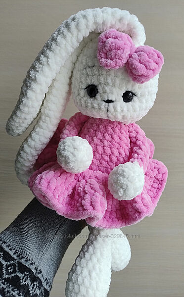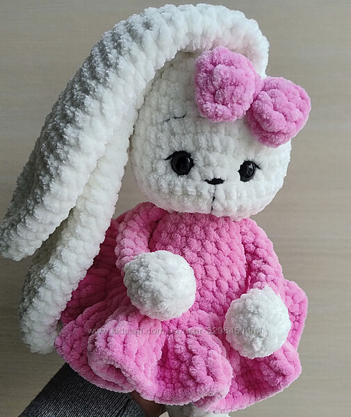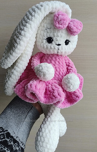 М´яка плюшева зайка, зв’язана вручну.Одягнена у милу рожеву сукню з бантиком.