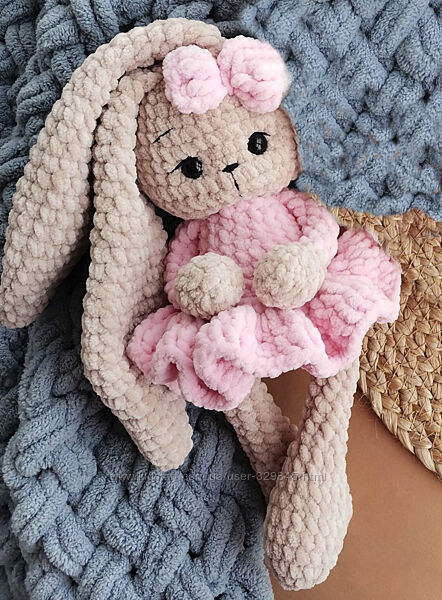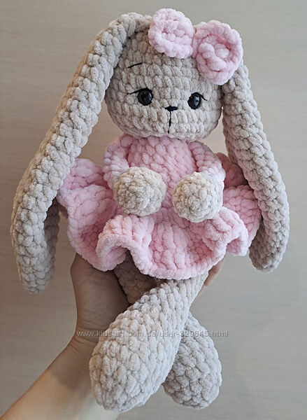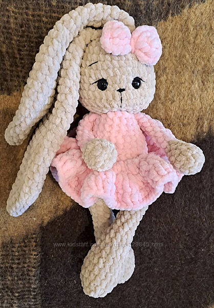 М´яка плюшева зайка, зв’язана вручну.Одягнена у милу ніжно рожеву сукню з бантиком.