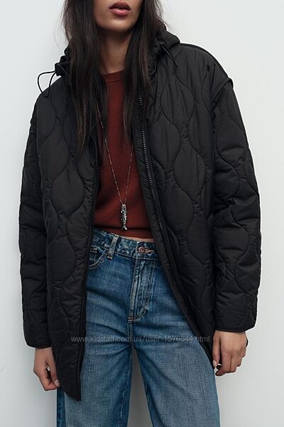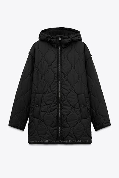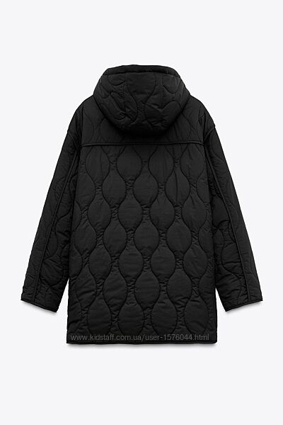 Куртка с высоким воротом, регулируемым капюшоном на шнурке и длинными рукавами. Прорезные передние карманы на кнопках. Низ с боковыми разрезами на кнопках. Застежка на молнию спереди.