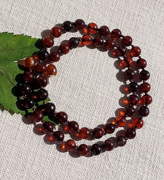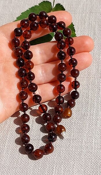 Магічна краса цього янтарного намиста відразу привертає до себе увагу. Цей справжній витвір мистецтва виготовлений із натурального цільного бурштину благородних вишневих відтінків.