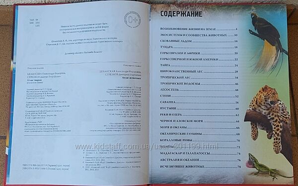 На красочных разворотах атласа представлено свыше 200 иллюстраций и более 250 занимательных статей о животных со всего мира и среде их обитания.